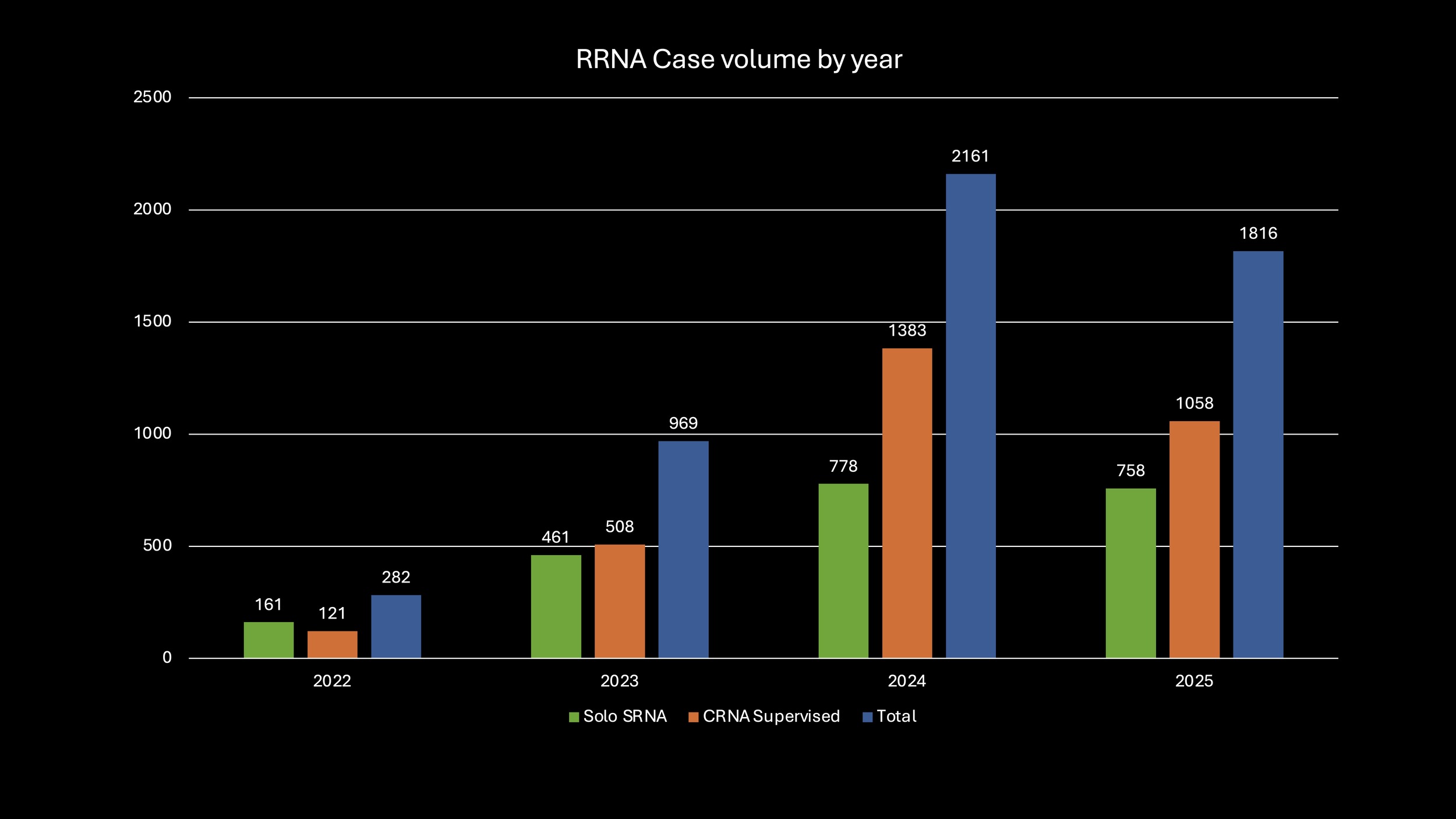 As the RRNA numbers have grown total case volume including their participation has increased as well. Figure 4 displays the annual case volume at this facility by solo RRNA, CRNA supervised RRNA and total volume of cases with RRNAs, starting from 2022 when the cases started being coded in the electronic medical record for RRNAs.